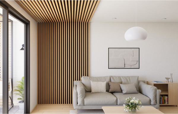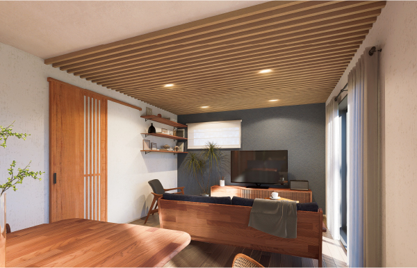 室内を彩るルーバーデザイン。壁面や天井など、こだわりの木目柄で他にはない内装コーディネートが可能。エバーアートウッドと同じリアルな表情の木柄シートをラッピングすることで、内装デザインにこだわりのルーバー演出を実現します。